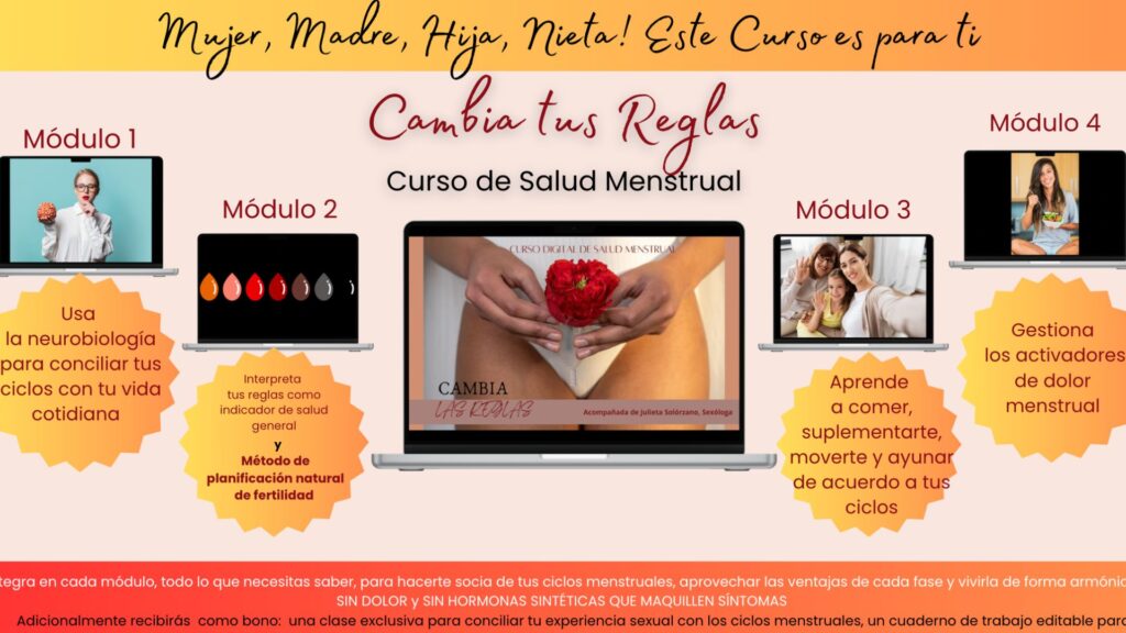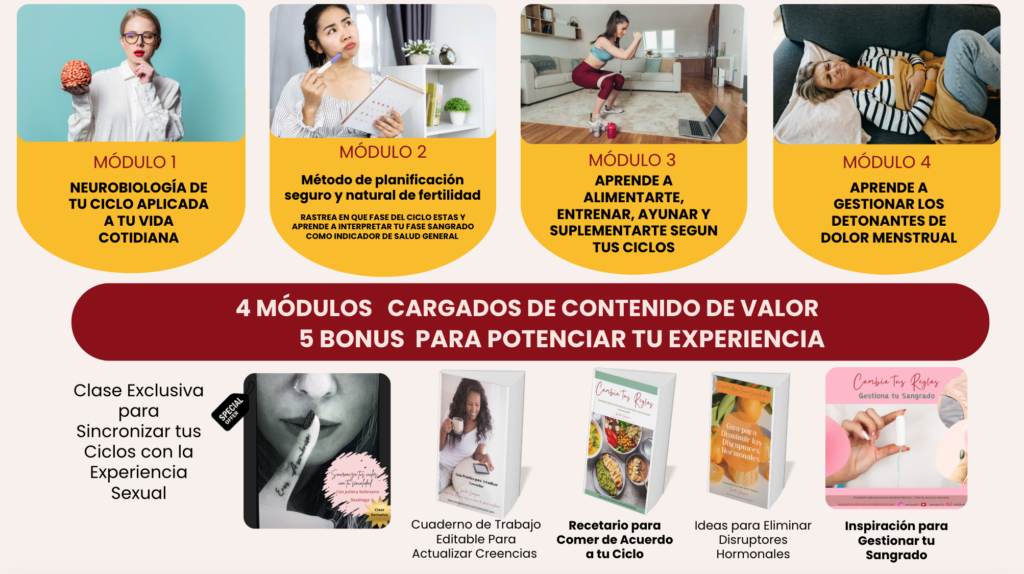 Cambia tus Reglas es la solución online pregrabada con 4 módulos para transformar tu experiencia menstrual y la relación con tus ciclos y tu cuerpo. Aquí aprendes a equilibrar tus hormonas y a usar el ciclo a tu favor, para sumar calma, energía y claridad mental.